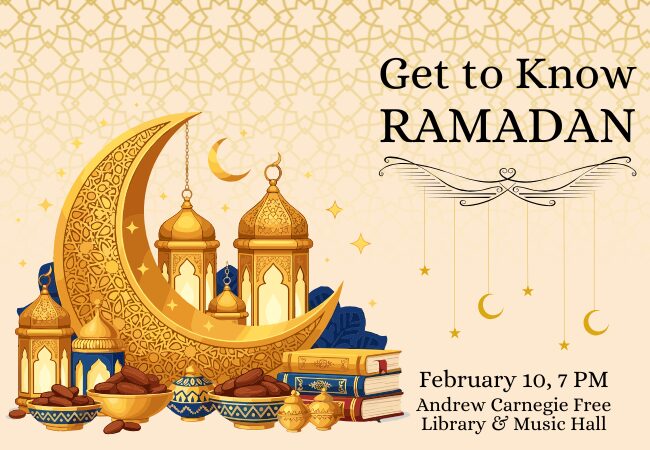Andrew Carnegie Free Library & Music Hall 300 Beechwood Avenue, Carnegie, PA, United StatesJoin members of the Attawheed Islamic Center for a fun exploration of Ramadan! You'll learn about the history of this important month, the significance of the Quran in Ramadan, the effects of fasting, and a day in the life of a Muslim during Ramadan. Come learn about this period observed by over two billion people Read More