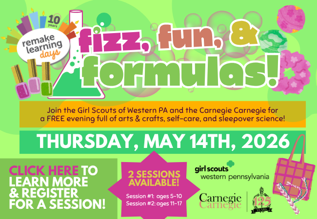 Join the Girl Scouts of Western PA and the Carnegie Carnegie for an evening full of arts & crafts, self-care, and sleepover science! This event is FREE and open to the public; all materials will be provided. PLEASE NOTE: Fizz, Formulas, and Fun will be divided up into two sessions based on age group. Registration for this Read More