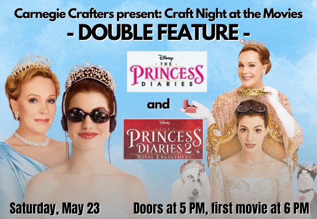 Craft Night at the Movies DOUBLE FEATURE: “The Princess Diaries” (2001) and “The Princess Diaries 2: Royal Engagement” (2004) May 23 Craft Night at the Movies DOUBLE FEATURE: “The Princess Diaries” (2001) and “The Princess Diaries 2: Royal Engagement” (2004) 5:00 pm - 10:30 pm Free