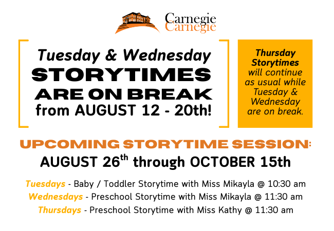 * Tuesday and Wednesday Storytimes run on a schedule of 7- to 8-week sessions followed by a 2- to 4-week break. Thursday Storytimes will run year-round. Read about this schedule on our blog here.