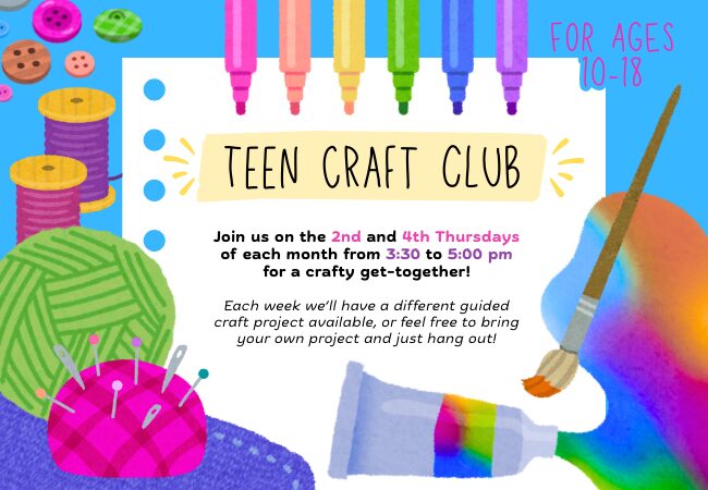 Teens (ages 12-18) can help shape the library’s services and programming for teens, connect with like-minded peers, and act as a library ambassador in your community.