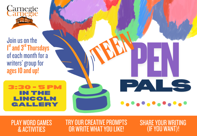 Or, join the Carnegie Carnegie’s Teen Library Council (TLC) to take an active role in shaping the Library’s services to teens! Expand to learn more.